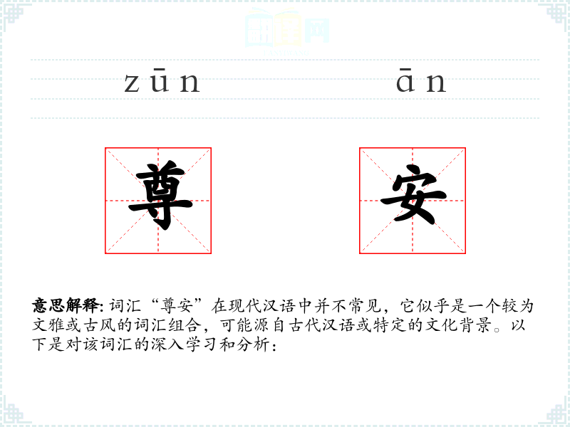 词汇“尊安”在现代汉语中并不常见,它似乎是一个较为文雅或古风的词汇组合,可能源自古代汉语或特定的文化背景。以下是对该词汇的深入学*和分析: