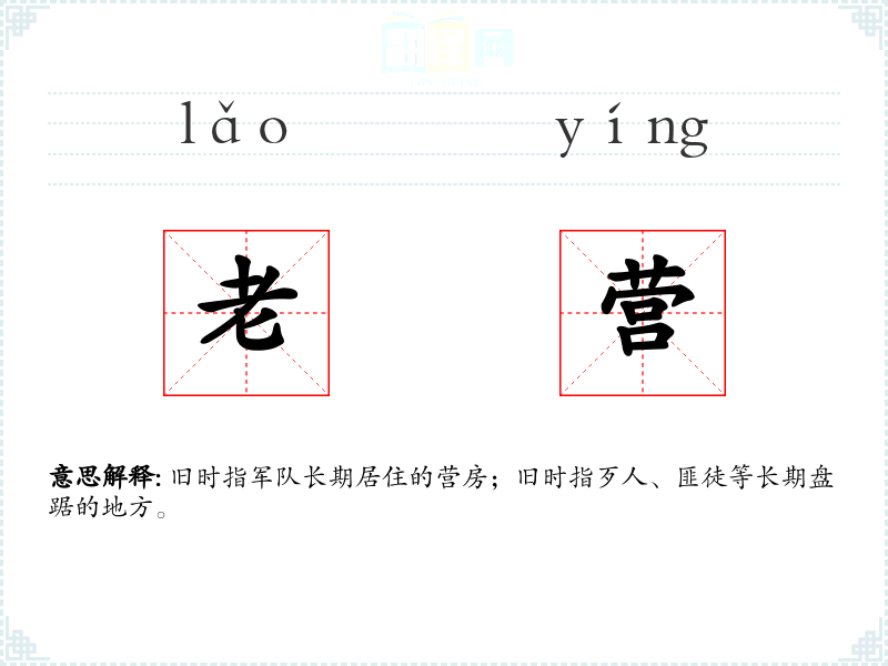 旧时指军队长期居住的营房;旧时指歹人、匪徒等长期盘踞的地方。