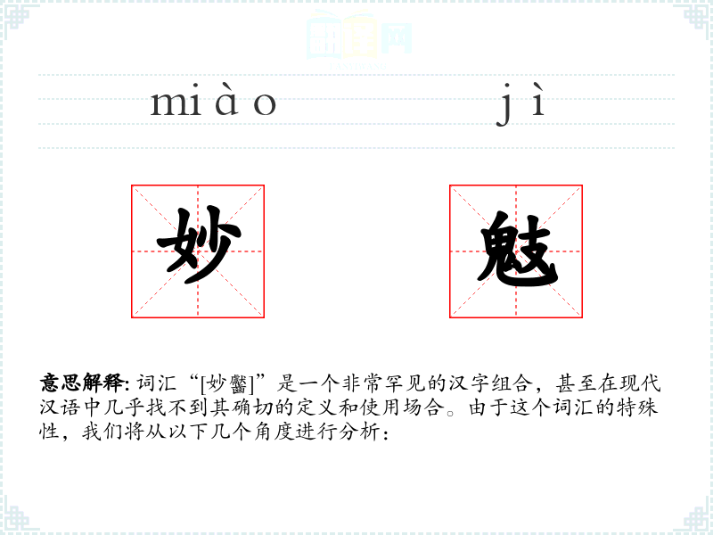 由于“[妙齾]”不是一个标准词汇,我们无法对其进行深入的理解和总结。它可能是一个古文中的生僻字组合,或者是一个现代创造的词汇,但由于缺乏确切的定义和使用场合,我们无法对其进行详细的分析。