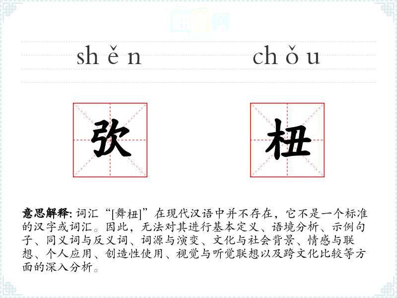 词汇“[舞杻]”在现代汉语中并不存在,它不是一个标准的汉字或词汇。因此,无法对其进行基本定义、语境分析、示例句子、同义词与反义词、词源与演变、文化与社会背景、情感与联想、个人应用、创造性使用、视觉与听觉联想以及跨文化比较等方面的深入分析。