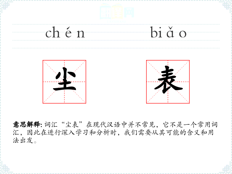 词汇“尘表”在现代汉语中并不常见,它不是一个常用词汇,因此在进行深入学习和分析时,我们需要从其可能的含义和用法出发。