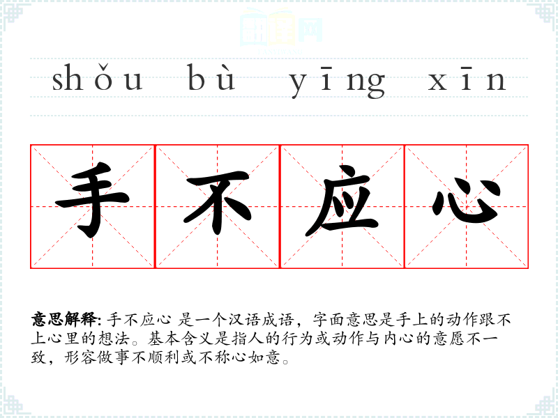 手不应心 是一个汉语成语,字面意思是手上的动作跟不上心里的想法。基本含义是指人的行为或动作与内心的意愿不一致,形容做事不顺利或不称心如意。