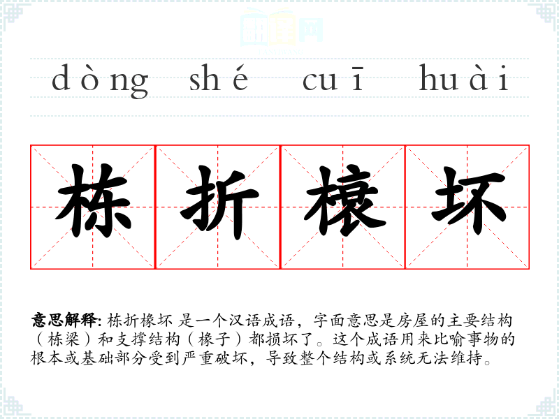 栋折椽坏 是一个汉语成语,字面意思是房屋的主要结构(栋梁)和支撑结构(椽子)都损坏了。这个成语用来比喻事物的根本或基础部分受到严重破坏,导致整个结构或系统无法维持。