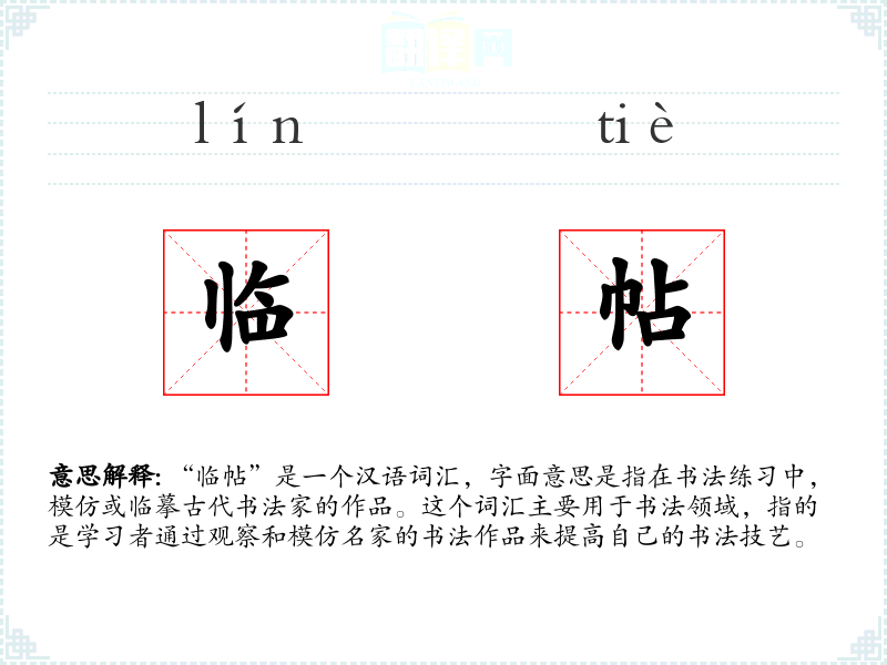 “临帖”是一个汉语词汇,字面意思是指在书法练中,模仿或临摹古代书法家的作品。这个词汇主要用于书法领域,指的是学者通过观察和模仿名家的书法作品来提高自己的书法技艺。