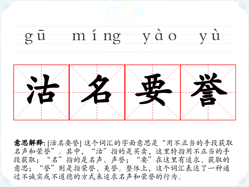 [沽名要誉] 这个词汇的字面意思是“用不正当的手段获取名声和荣誉”。其中,“沽”指的是买卖,这里特指用不正当的手段获取;“名”指的是名声、声誉;“要”在这里有追求、获取的意思;“誉”则是指荣誉、美誉。整体上,这个词汇表达了一种通过不诚实或不道德的方式来追求名声和荣誉的行为。
