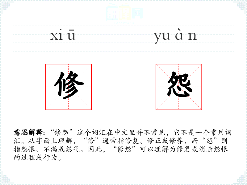 “修怨”这个词汇在中文里并不常见,它不是一个常用词汇。从字面上理解,“修”通常指修复、修正或修养,而“怨”则指怨恨、不满或怨气。因此,“修怨”可以理解为修复或消除怨恨的过程或行为。
