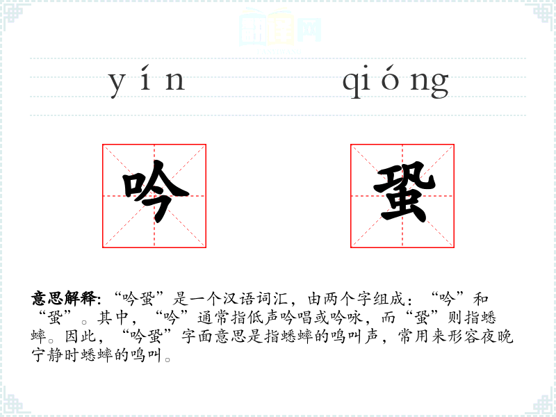 “吟蛩”是一个汉语词汇,由两个字组成:“吟”和“蛩”。其中,“吟”通常指低声吟唱或吟咏,而“蛩”则指蟋蟀。因此,“吟蛩”字面意思是指蟋蟀的鸣叫声,常用来形容夜晚宁静时蟋蟀的鸣叫。