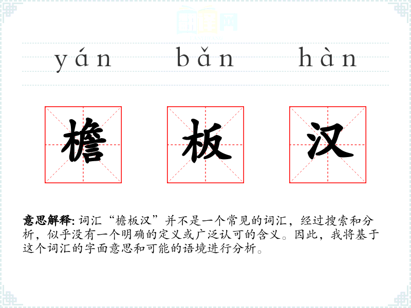 词汇“檐板汉”并不是一个常见的词汇,经过搜索和分析,似乎没有一个明确的定义或广泛认可的含义。因此,我将基于这个词汇的字面意思和可能的语境进行分析。
