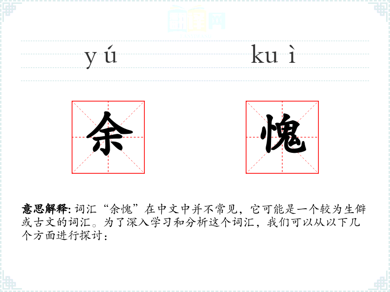 词汇“余愧”在中文中并不常见,它可能是一个较为生僻或古文的词汇。为了深入学*和分析这个词汇,我们可以从以下几个方面进行探讨: