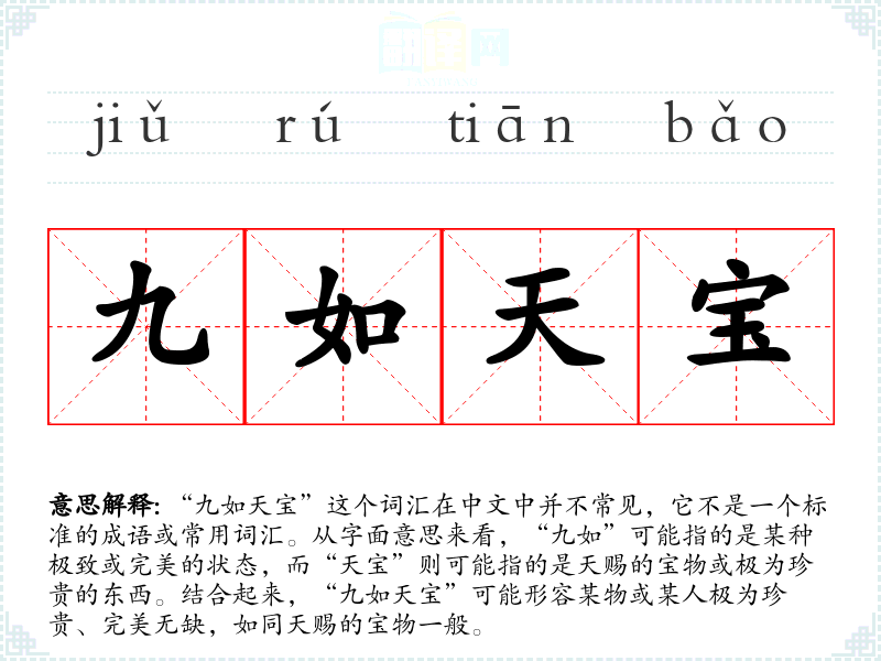在特定的文化或社会背景中,如果有人使用“九如天宝”这个词汇,可能是为了强调某物的珍贵和完美,或者是在特定的文学创作中使用,以增加语言的艺术性和独特性。