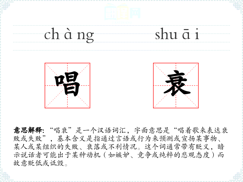 "唱衰"的意思解释、唱衰是什么意思由翻译网汉语词典查词提供。