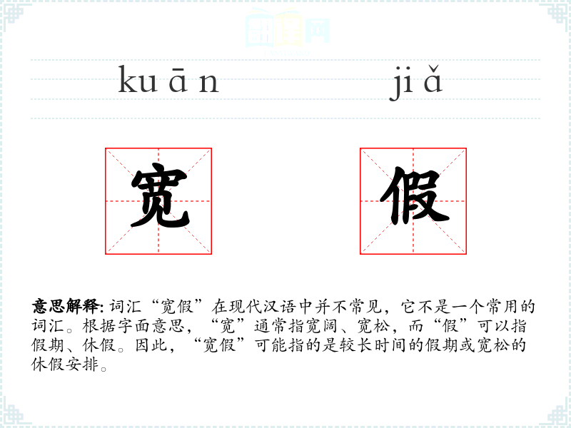 - 演变:在现代汉语中,“宽假”不是一个常用词汇,可能是由“宽”和“假”两个词组合而成的新词。
