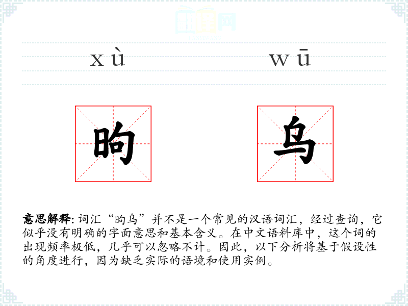 由于“昫乌”不是一个标准词汇,我们无法提供确切的基本定义。它可能是某个特定领域或方言中的词汇,或者是拼写错误。