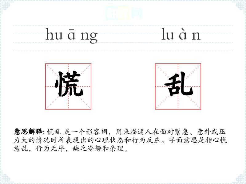 慌乱 是一个形容词,用来描述人在面对紧急、意外或压力大的情况时所表现出的心理状态和行为反应。字面意思是指心慌意乱,行为无序,缺乏冷静和条理。