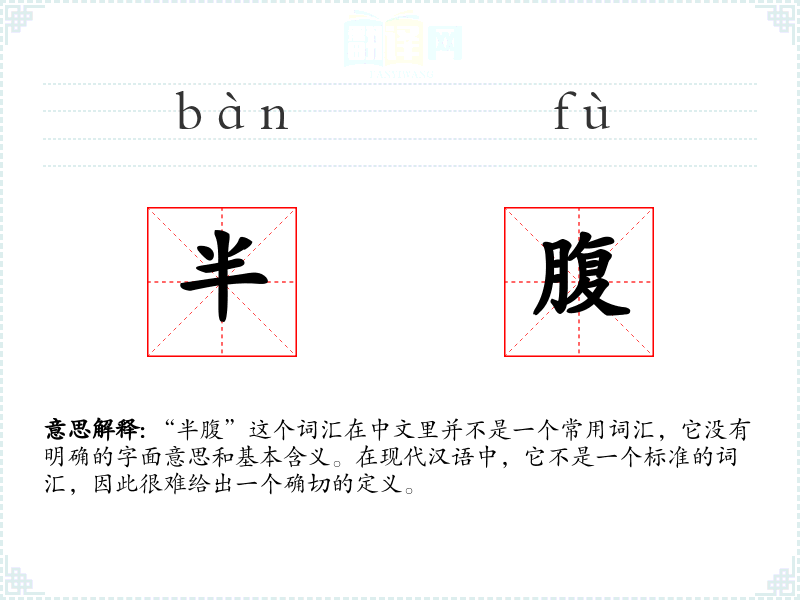 “半腹”这个词汇在中文里并不是一个常用词汇,它没有明确的字面意思和基本含义。在现代汉语中,它不是一个标准的词汇,因此很难给出一个确切的定义。