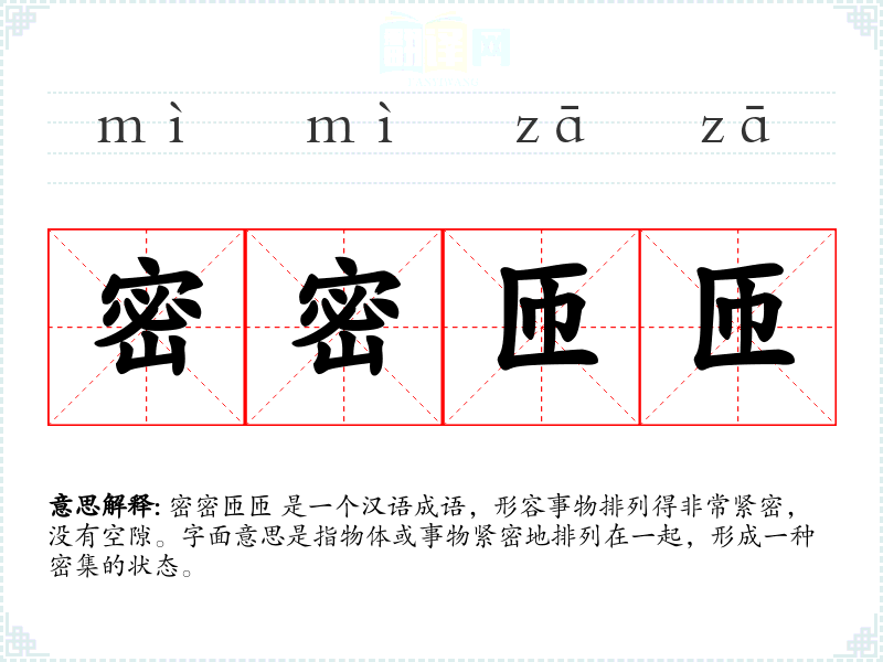 密密匝匝 是一个汉语成语,形容事物排列得非常紧密,没有空隙。字面意思是指物体或事物紧密地排列在一起,形成一种密集的状态。