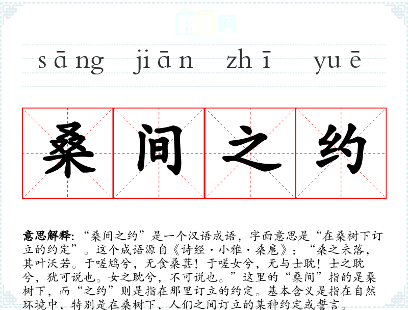 “桑间之约”是一个汉语成语,字面意思是“在桑树下订立的约定”。这个成语源自《诗经·小雅·桑扈》:“桑之未落,其叶沃若。于嗟鸠兮,无食桑葚!于嗟女兮,无与士耽!士之耽兮,犹可说也。女之耽兮,不可说也。”这里的“桑间”指的是桑树下,而“之约”则是指在那里订立的约定。基本含义是指在自然环境中,特别是在桑树下,人们之间订立的某种约定或誓言。