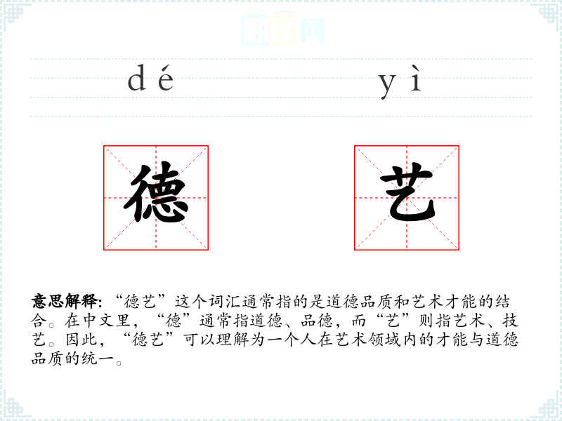 “德艺”这个词汇通常指的是道德品质和艺术才能的结合。在中文里,“德”通常指道德、品德,而“艺”则指艺术、技艺。因此,“德艺”可以理解为一个人在艺术领域内的才能与道德品质的统一。
