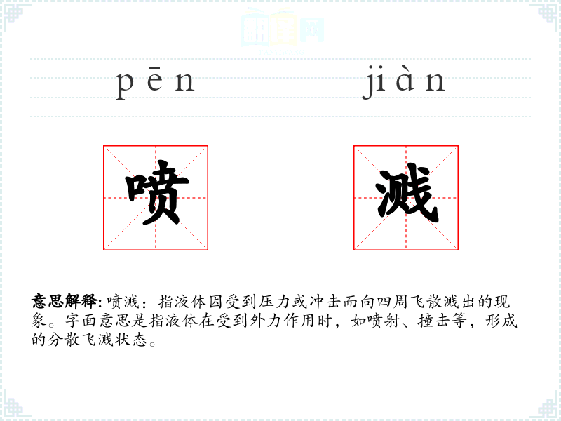喷溅的词源较为直接,由“喷”和“溅”两个字组成,分别表示喷射和溅出的动作。在古代汉语中,类似的表达可能更为简单,如“溅”字本身就有飞溅的意思。随着语言的发展,这类复合词逐渐丰富了表达的细腻程度。