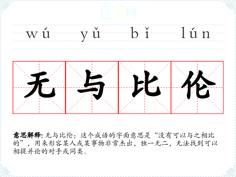 无与比伦:这个成语的字面意思是“没有可以与之相比的”,用来形容某人或某事物非常杰出,独一无二,无法找到可以相提并论的对手或同类。