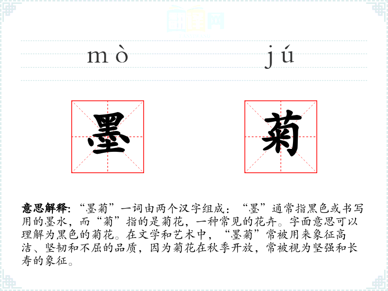 “墨菊”一词由两个汉字组成:“墨”通常指黑色或书写用的墨水,而“菊”指的是菊花,一种常见的花卉。字面意思可以理解为黑色的菊花。在文学和艺术中,“墨菊”常被用来象征高洁、坚韧和不屈的品质,因为菊花在秋季开放,常被视为坚强和长寿的象征。