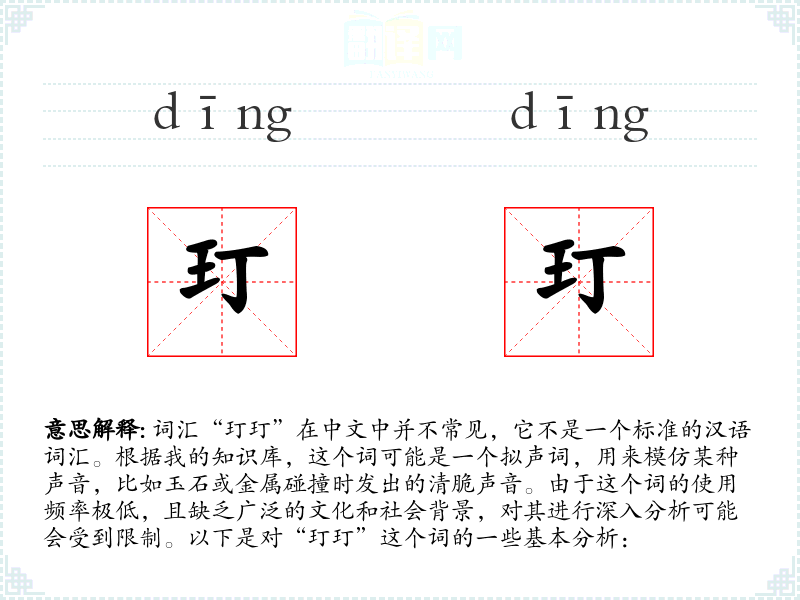 - “玎玎”作为一个拟声词,虽然在日常语言中不常用,但在特定的文学和艺术创作中可能具有独特的表达效果。了解这样的词汇可以丰富语言的表达能力,尤其是在创造性写作和表演中。