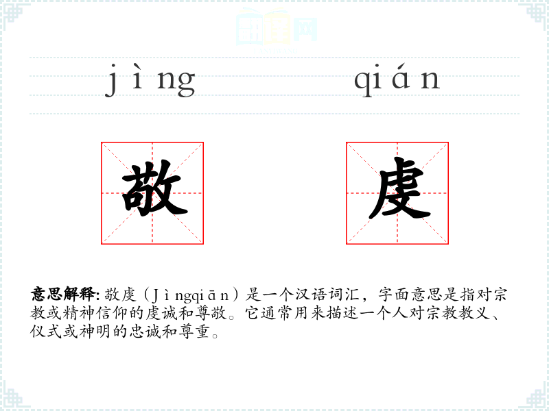 敬虔(Jìngqiān)是一个汉语词汇,字面意思是指对或精神信仰的虔诚和尊敬。它通常用来描述一个人对教义、仪式或神明的忠诚和尊重。