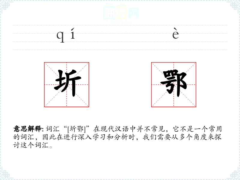 “圻鄂”这个词汇在现代汉语中并不常用,它的意义和使用需要结合具体的历史文献或语境来理解。在学*汉语时,了解这样的词汇可以帮助我们更深入地理解汉语的历史和文化。然而,由于它的使用频率较低,我们在日常交流中可能不会经常遇到或使用到这个词汇。