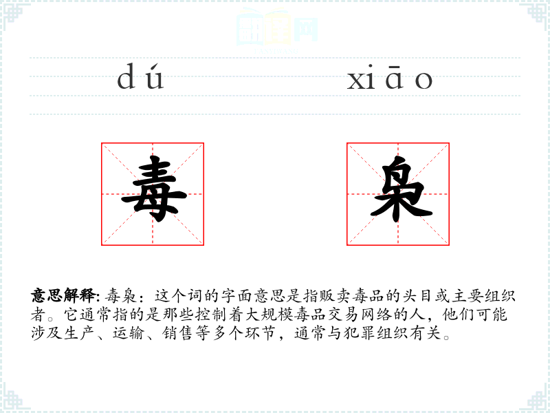 毒枭:这个词的字面意思是指贩卖毒品的头目或主要组织者。它通常指的是那些控制着***毒品交易网络的人,他们可能涉及生产、运输、销售等多个环节,通常与犯罪组织有关。