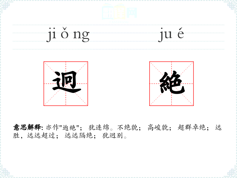 亦作"逈絶"; 犹连绵。不绝貌; 高峻貌; 超群卓绝; 远胜,远远超过; 远远隔绝; 犹迥别。