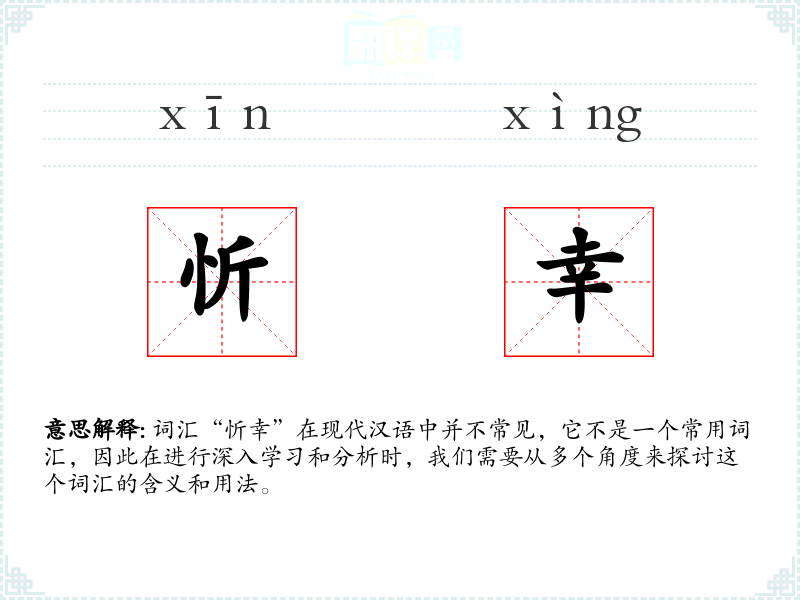 词汇“忻幸”在现代汉语中并不常见,它不是一个常用词汇,因此在进行深入学*和分析时,我们需要从多个角度来探讨这个词汇的含义和用法。
