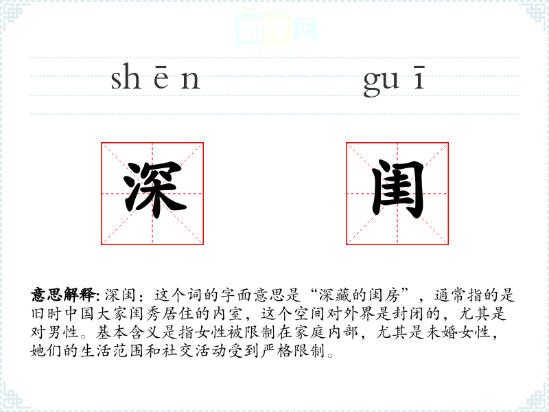 深闺:这个词的字面意思是“深藏的闺房”,通常指的是旧时**大家闺秀居住的内室,这个空间对外界是封闭的,尤其是对男性。基本含义是指女性被限制在家庭内部,尤其是未婚女性,她们的生活范围和社交活动受到严格限制。