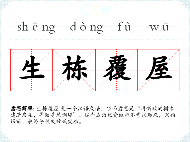 生栋覆屋 是一个汉语成语,字面意思是“用新砍的树木建造房屋,导致房屋倒塌”。这个成语比喻做事不考虑后果,只顾眼前,最终导致失败或灾难。