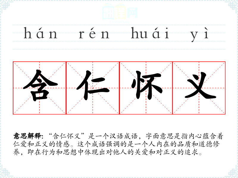 “含仁怀义”是一个汉语成语,字面意思是指内心蕴含着仁爱和正义的情感。这个成语强调的是一个人内在的品质和道德修养,即在行为和思想中体现出对他人的关爱和对正义的追求。