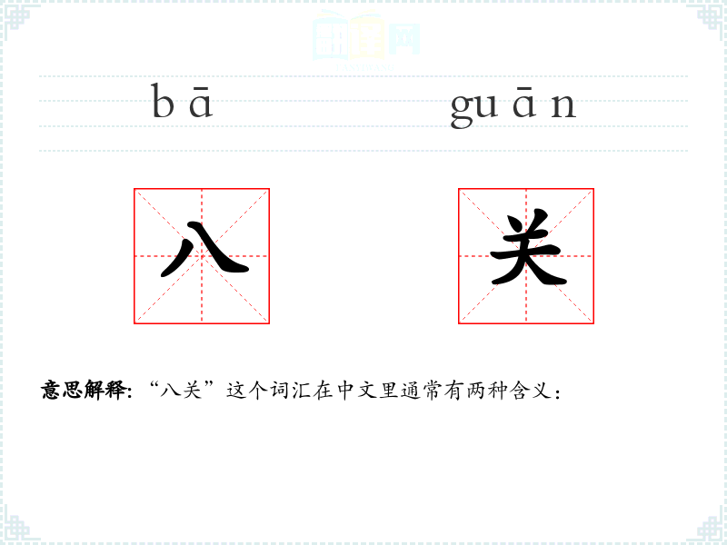 “八关”这个词汇不仅承载了历史和文化的厚重,也具有很强的比喻意义,能够丰富我们的语言表达。在学*语言和表达时,理解和运用这样的词汇能够增强我们的语言能力和文化素养。