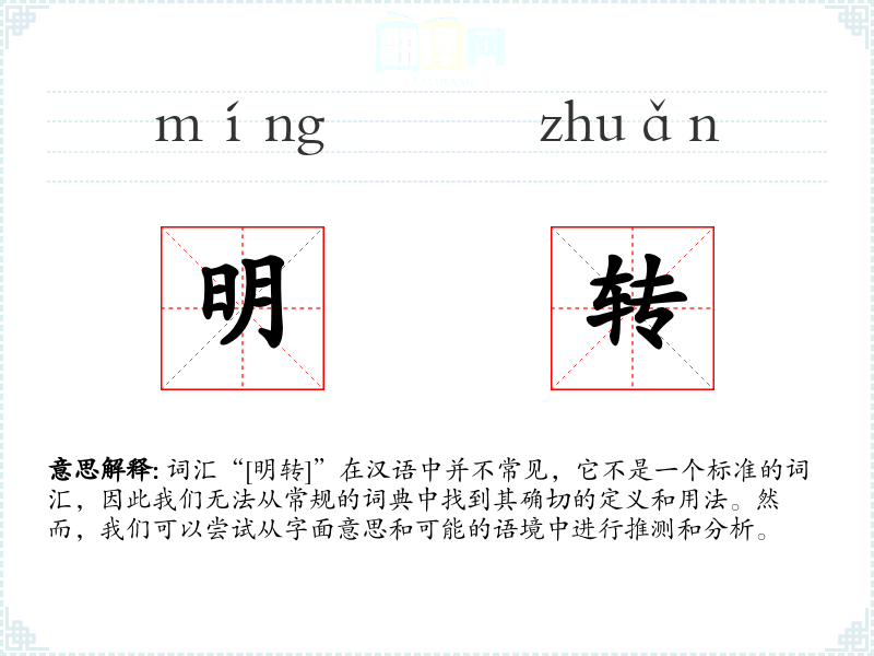 词汇“[明转]”在汉语中并不常见,它不是一个标准的词汇,因此我们无法从常规的词典中找到其确切的定义和用法。然而,我们可以尝试从字面意思和可能的语境中进行推测和分析。