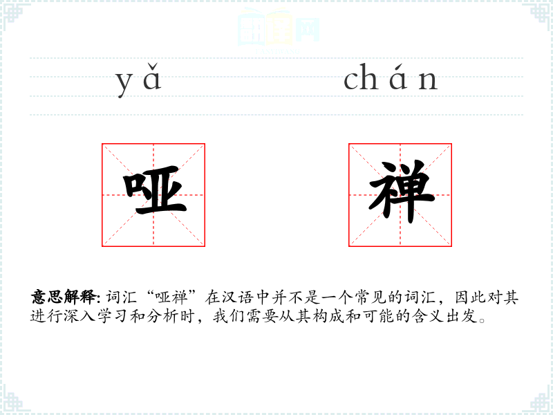 词汇“哑禅”在汉语中并不是一个常见的词汇,因此对其进行深入学*和分析时,我们需要从其构成和可能的含义出发。