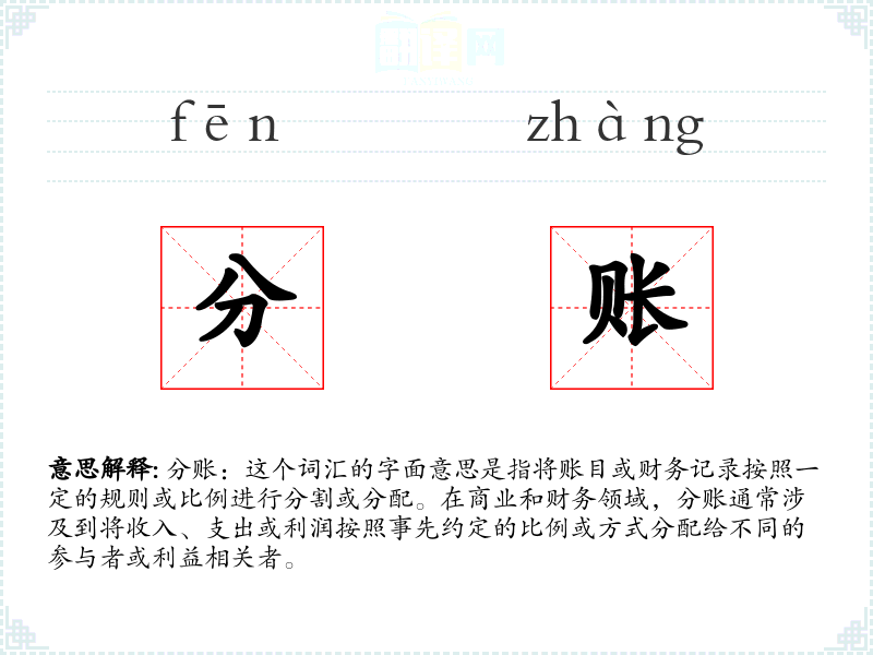 分账:这个词汇的字面意思是指将账目或财务记录按照一定的规则或比例进行分割或分配。在商业和财务领域,分账通常涉及到将收入、支出或利润按照事先约定的比例或方式分配给不同的参与者或利益相关者。