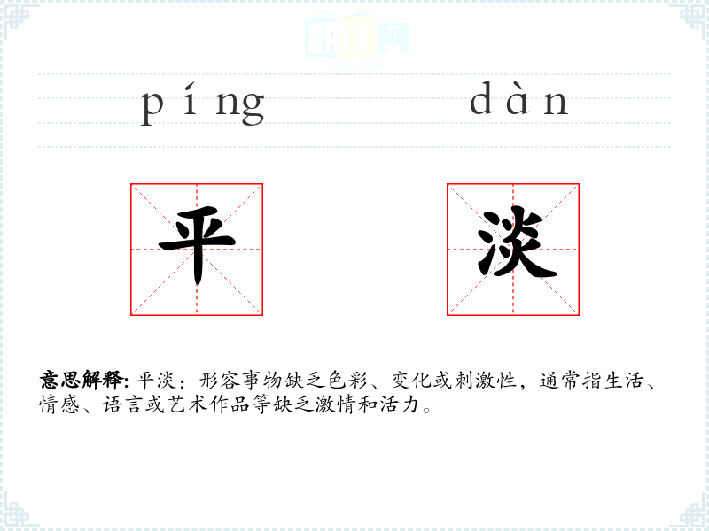 平淡:形容事物缺乏色彩、变化或刺激性,通常指生活、情感、语言或艺术作品等缺乏激情和活力。