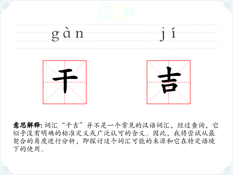 由于“干吉”不是一个标准词汇,我们无法给出一个确切的基本定义。它可能是某个地方方言中的词汇,或者是某个特定社群中的术语。