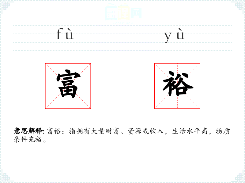 富裕:指拥有大量财富、资源或收入,生活水平高,物质条件充裕。