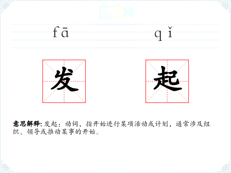 发起:动词,指开始进行某项活动或计划,通常涉及组织、领导或推动某事的开始。