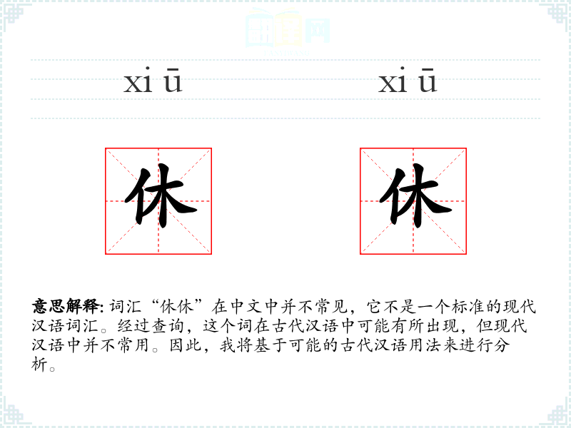 词汇“休休”在中文中并不常见,它不是一个标准的现代汉语词汇。经过查询,这个词在古代汉语中可能有所出现,但现代汉语中并不常用。因此,我将基于可能的古代汉语用法来进行分析。