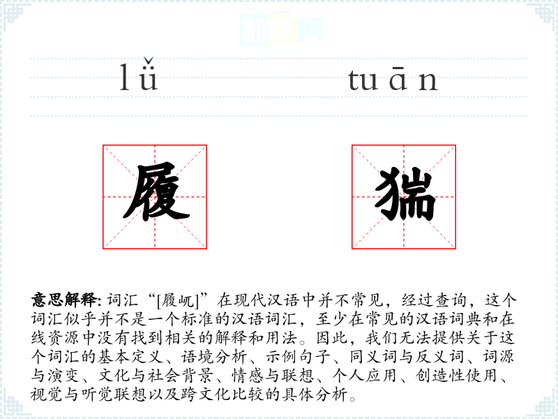 由于“[履屼]”不是一个已知的词汇,我们无法对其进行深入的学习和分析。如果你有更多的上下文信息或者是指的另一个词汇,请提供更多的细节,以便我们能够提供更准确的帮助。