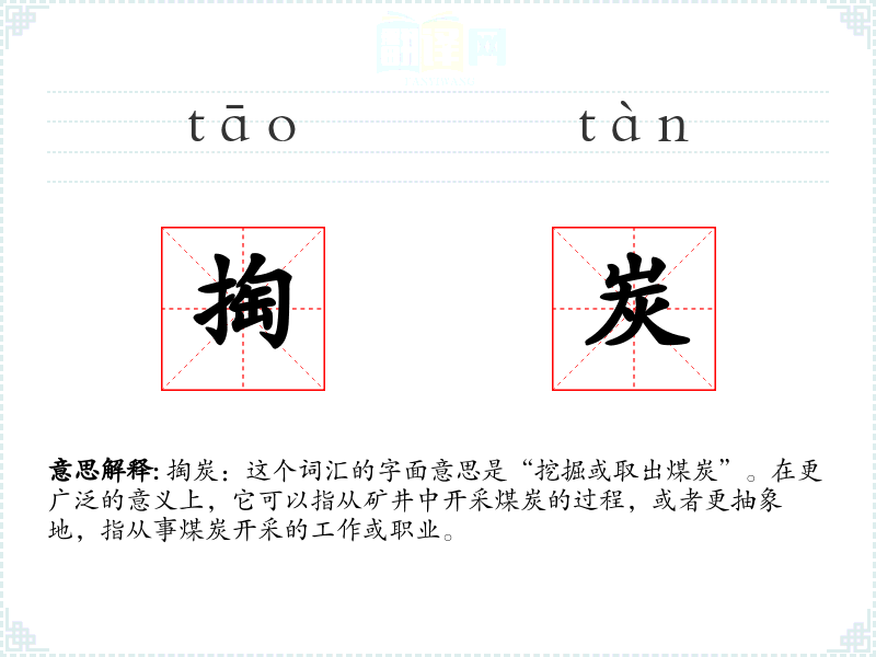 掏炭:这个词汇的字面意思是“挖掘或取出煤炭”。在更广泛的意义上,它可以指从矿井中开采煤炭的过程,或者更抽象地,指从事煤炭开采的工作或职业。