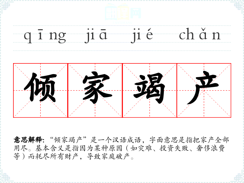 “倾家竭产”是一个汉语成语,字面意思是指把家产全部用尽。基本含义是指因为某种原因(如灾难、投资失败、奢侈浪费等)而耗尽所有财产,导致家庭破产。
