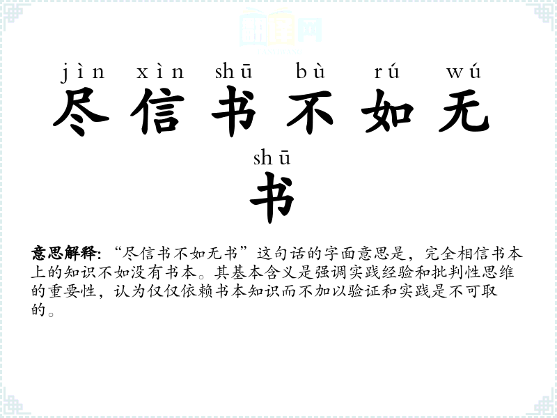 “尽信书不如无书”这句话的字面意思是,完全相信书本上的知识不如没有书本。其基本含义是强调实践经验和批判性思维的重要性,认为仅仅依赖书本知识而不加以验证和实践是不可取的。