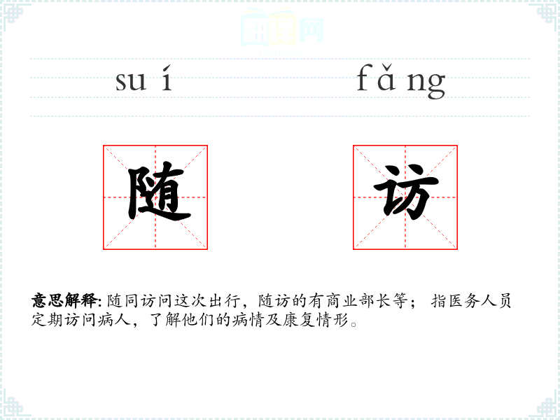 随同访问这次出行,随访的有商业部长等; 指医务人员定期访问病人,了解他们的病情及康复情形。