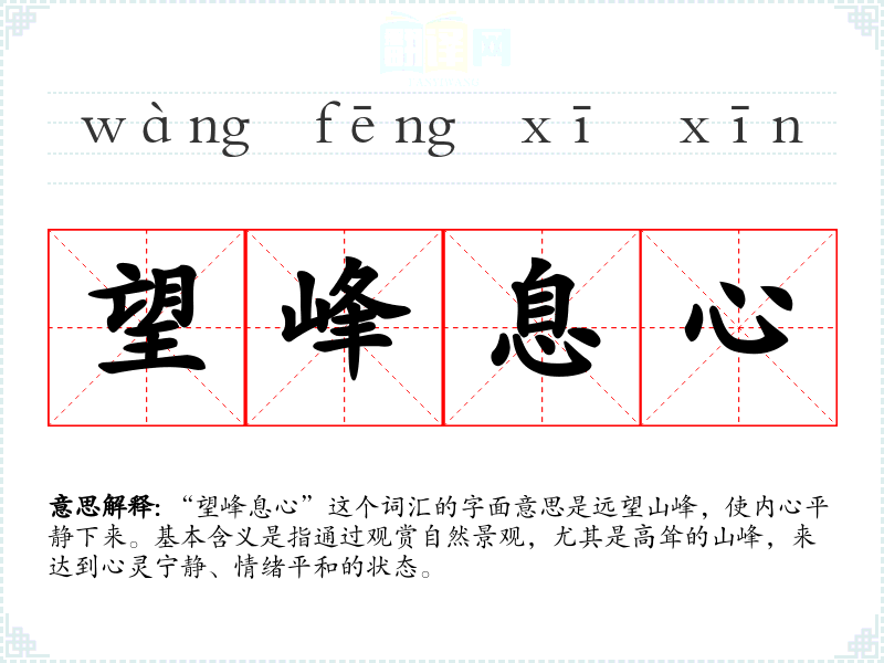 “望峰息心”这个词汇可能是现代汉语中新创造的表达,结合了“望峰”和“息心”两个词,前者指观赏山峰,后者指使心平静。在古代文学中,类似的表达可能是“登高望远”或“临峰静思”。