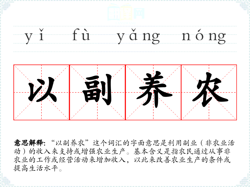 “以副养农”这个词汇的字面意思是利用副业(非农业活动)的收入来支持或增强农业生产。基本含义是指农民通过从事非农业的工作或经营活动来增加收入,以此来改善农业生产的条件或提高生活水平。